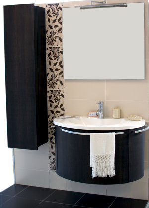 tranché, specchio modello DE LUX rettangolare con faretto modello STREEM 1, colonna modello CUBO con anta contenitore, piano in